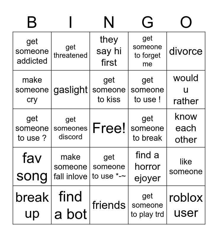 This bingo card has a free space and 24 words: make someone fall inlove, find a bot, get someone to kiss, break up, divorce, get someone addicted, make someone cry, get threatened, get someone to break, get someone to use *-~, get someone to use !, get someone to use ?, find a horror ejoyer, like someone, gaslight, get someone to play trd, know each other, they say hi first, would u rather, get someones discord, roblox user, fav song, get someone to forget me and friends.