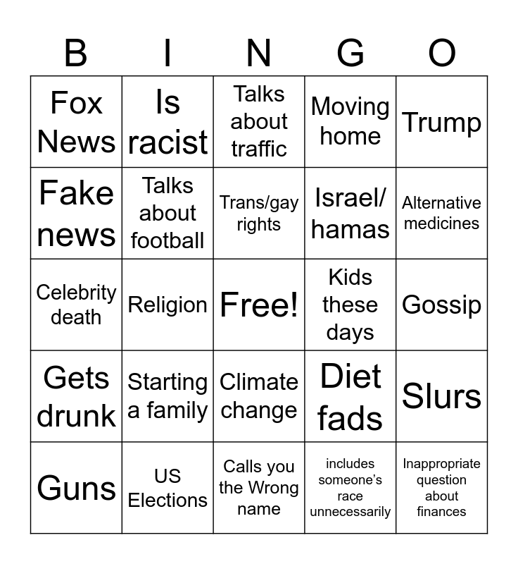 This bingo card has a free space and 24 words: Starting a family, US Elections, Trans/gay rights, Guns, Trump, Fox News, Fake news, Is racist, Kids these days, Climate change, Israel/ hamas, Celebrity death, Diet fads, Slurs, Talks about football, includes someone’s race unnecessarily, Gossip, Talks about traffic, Alternative medicines, Religion, Inappropriate question about finances, Gets drunk, Moving home and Calls you the Wrong name.