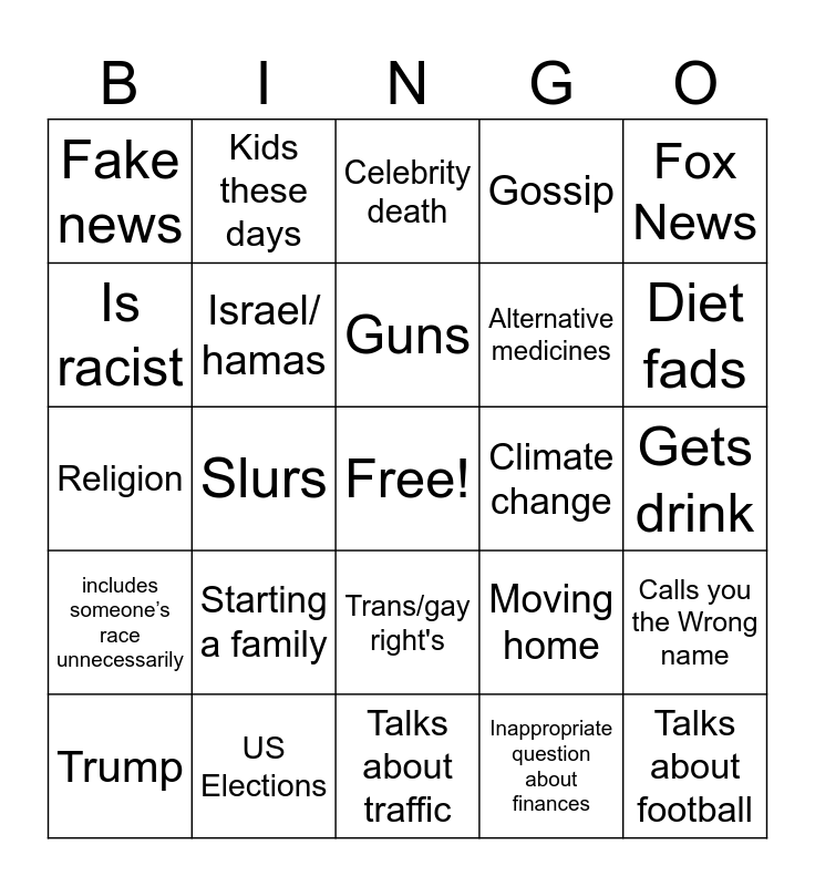 This bingo card has a free space and 24 words: Starting a family, US Elections, Guns, Trump, Fox News, Fake news, Is racist, Kids these days, Climate change, Trans/gay right's, Alternative medicines, Religion, Moving home, Calls you the Wrong name, Israel/ hamas, Inappropriate question about finances, Gets drink, Celebrity death, Diet fads, Slurs, Talks about football, includes someone’s race unnecessarily, Gossip and Talks about traffic.