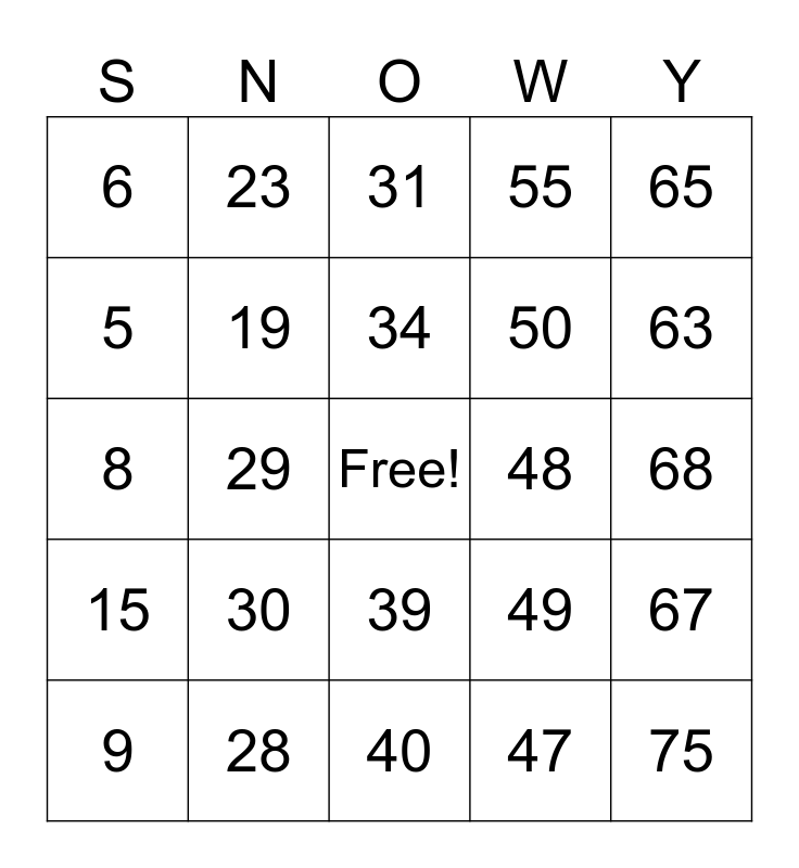 This bingo card has a free space and 75 words: 1, 16, 31, 46, 61, 2, 17, 32, 47, 62, 3, 18, 48, 63, 4, 19, 33, 49, 64, 5, 20, 34, 50, 65, 6, 21, 35, 51, 66, 7, 22, 36, 52, 67, 8, 23, 37, 53, 68, 9, 24, 38, 54, 69, 10, 25, 39, 55, 70, 11, 26, 40, 56, 71, 12, 27, 41, 57, 72, 13, 28, 42, 58, 73, 14, 29, 43, 59, 74, 15, 30, 44, 60, 75 and 45.