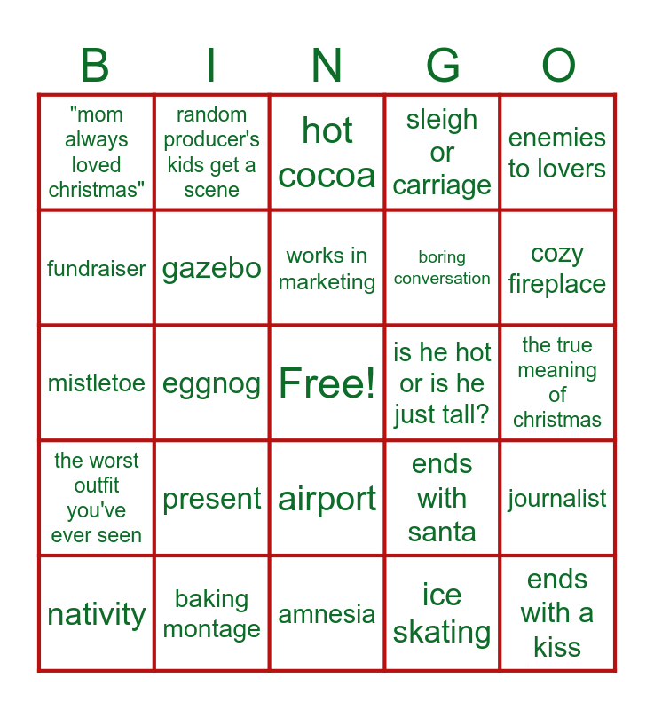 This bingo card has a free space and 99 words: dog, horse, "the big city", hot cocoa, santa, was that old man supposed to be santa?, trying on clothes montage, made a (cute) mess in the kitchen, oh no not the ex!, bakery, cupcakes, decorating a christmas tree, magical snowfall, airport, "i love christmas", "mom always loved christmas", random producer's kids get a scene, oh... is this military propaganda?, character doesn't like christmas, sassy best friend, more than 3 christmas trees in 1 room, santa hat, royalty, kiss!, fake country name, journalist, works in marketing, falls down in the snow, orphan, almost kiss, amnesia, ice skating, "things are different in a small town", a christmas ball, eggnog, mistletoe, proposal, special ornament, telling a christmas memory, present, a letter, cozy fireplace, sleigh or carriage, baking montage, single parent, red dress, town christmas festival, you believe they are in love, you do NOT believe they are in love, we watch them google something, candy cane, ends with a kiss, ends with santa, number of small town's population, magical twinkle in the eye, christmas magic, woman is wearing makeup when she should not be, farm, someone is named Noelle, someone is named Nick, someone is named Chris, winter themed last name, is this actor famous?, scarf, gotta save the town's christmas something, enemies to lovers, friends to lovers, rival families, jingle bells, the worst outfit you've ever seen, actually, that's a pretty cute outfit, boring conversation, fundraiser, woman loves chocolate, workaholic, dressed inappropriately for cold weather, gazebo, recently broken up with, car breaks down, is this pride and prejudice?, is he hot or is he just tall?, actual hot actors, snowman, snowball fight, wine, someone at this party tears up, job offer, grandparents, the true meaning of christmas, nativity, she is too good for him, a gay person?!?, caught in a lie, helping the needy, phone call from work, beautiful inn/hotel, old people are happy for the cute couple, bad improv dialogue and competition.