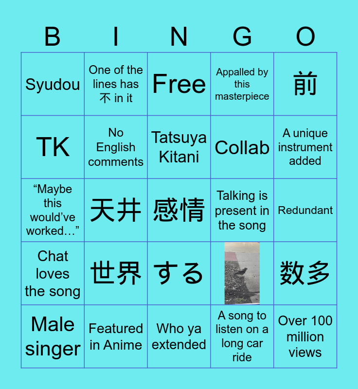 This bingo card has 1 images and 69 words: Unexpected ending, 天井, Sad, Interesting bridge, Redundant, 何もかも, One of the lines has 不 in it, Brightens up your day, Collab, About love in some way, Starts with lyrics, Cover, Free, Appalled by this masterpiece, Live better than studio version, Chat loves the song, Featured in Anime, Tatsuya Kitani, 日々, A unique instrument added, Male singer, Jazz, 感情, Cool guitar riff, I love the song, Scream, Use ぬ in the song, Talking is present in the song, 祈り, Syudou, Too simple; I can replicate, 退屈, 未来, Already listened, 言葉, Cool bass line, Effects like rain or nature sounds, A song to listen on a long car ride, 前, 米津玄師, 世界, する, Has a music video, Ado, TK, About death in some way, 中 (ちゅう), Reminds me of Kpop, 嘘, 見つけ, 悪 (わる), Who ya extended, Generic, 数多, About friends in some way, No English comments, Underground artist with less than 50K subscribers, Eve, Over 100 million views, “Maybe this would’ve worked…”, 恋, Zutomayo, Long silence at the end until next song, Released before 2019, Timeless, どうして, 冷たい, Female singer and 声 (せい).