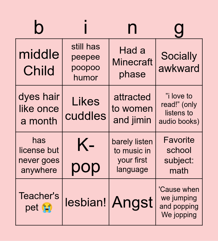 This bingo card has 25 words: namjoon bias π, EAT SOUP EAT SOUP EAT SOUP, βi love to read!β (only listens to audio books), always eepy, dyes hair like once a month, middle Child, Likes cuddles, still has peepee poopoo humor, lesbian!, went thru an intense emo phase, has license but never goes anywhere, barely listen to music in your first language, cat person, play minecraft, attracted to women and jimin, crochetπ§Ά, Angst, Had a Minecraft phase, K-pop, Favorite school subject: math, Teacher's pet π, soft boi, 'Cause when we jumping and popping We jopping, Socially awkward and Hot cocoa and cheez-its.