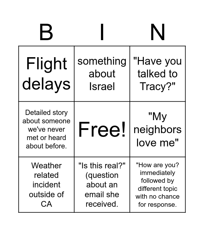 This bingo card has a free space and 8 words: "My neighbors love me", "Have you talked to Tracy?", something about Israel, Weather related incident outside of CA, Flight delays, "How are you? immediately followed by different topic with no chance for response., Detailed story about someone we've never met or heard about before. and "Is this real?" (question about an email she received..