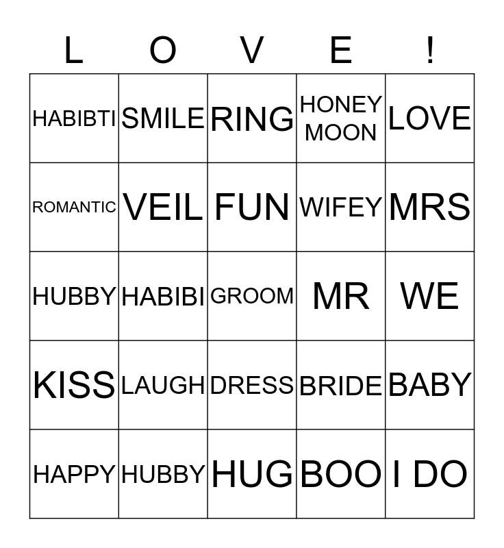 This bingo card has a free space and 24 words: LAUGH, HUBBY, FUN, HAPPY, LOVE, HABIBTI, ROMANTIC, SMILE, MR, DRESS, WIFEY, HUBBY, BRIDE, BABY, VEIL, BOO, WE, RING, MRS, HABIBI, I DO, KISS, HONEY MOON and HUG.