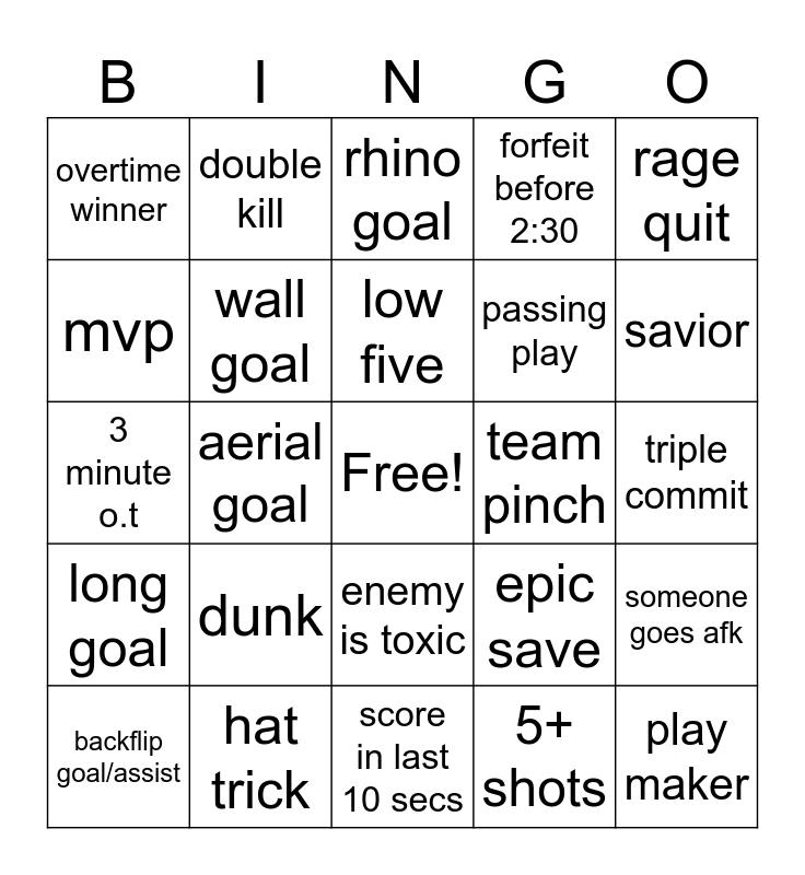 This bingo card has a free space and 24 words: dunk, hat trick, low five, backflip goal/assist, rage quit, overtime winner, mvp, double kill, team pinch, enemy is toxic, passing play, 3 minute o.t, epic save, someone goes afk, wall goal, 5+ shots, triple commit, rhino goal, savior, aerial goal, play maker, long goal, forfeit before 2:30 and score in last 10 secs.