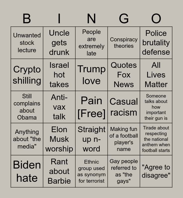 This bingo card has a free space and 24 words: Elon Musk worship, Rant about Barbie, Trump love, Biden hate, Police brutality defense, Unwanted stock lecture, Crypto shilling, Uncle gets drunk, Casual racism, Straight up n-word, Quotes Fox News, Still complains about Obama, Making fun of a football player's name, Tirade about respecting the national anthem when football starts, Israel hot takes, Gay people referred to as "the gays", Someone talks about how important their gun is, People are extremely late, All Lives Matter, Anti-vax talk, "Agree to disagree", Anything about "the media", Conspiracy theories and Ethnic group used as synonym for terrorist.