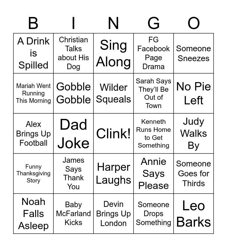 This bingo card has a free space and 25 words: James Says Thank You, Devin Brings Up London, Wilder Squeals, Noah Falls Asleep, Someone Sneezes, A Drink is Spilled, Mariah Went Running This Morning, Christian Talks about His Dog, Kenneth Runs Home to Get Something, Harper Laughs, Sarah Says They’ll Be Out of Town, Alex Brings Up Football, Annie Says Please, Someone Goes for Thirds, Gobble Gobble, Sarah Beth Gets Hiccups, Judy Walks By, Sing Along, No Pie Left, Dad Joke, Leo Barks, Baby McFarland Kicks, Funny Thanksgiving Story, FG Facebook Page Drama and Someone Drops Something.