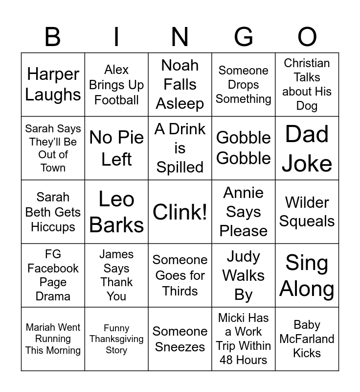 This bingo card has a free space and 25 words: James Says Thank You, Someone Sneezes, A Drink is Spilled, Mariah Went Running This Morning, Christian Talks about His Dog, Harper Laughs, Sarah Says They’ll Be Out of Town, Alex Brings Up Football, Annie Says Please, Someone Goes for Thirds, Gobble Gobble, Sarah Beth Gets Hiccups, Judy Walks By, Sing Along, No Pie Left, Devin Brings Up London, Wilder Squeals, Noah Falls Asleep, Dad Joke, Leo Barks, Baby McFarland Kicks, Funny Thanksgiving Story, FG Facebook Page Drama, Someone Drops Something and Micki Has a Work Trip Within 48 Hours.