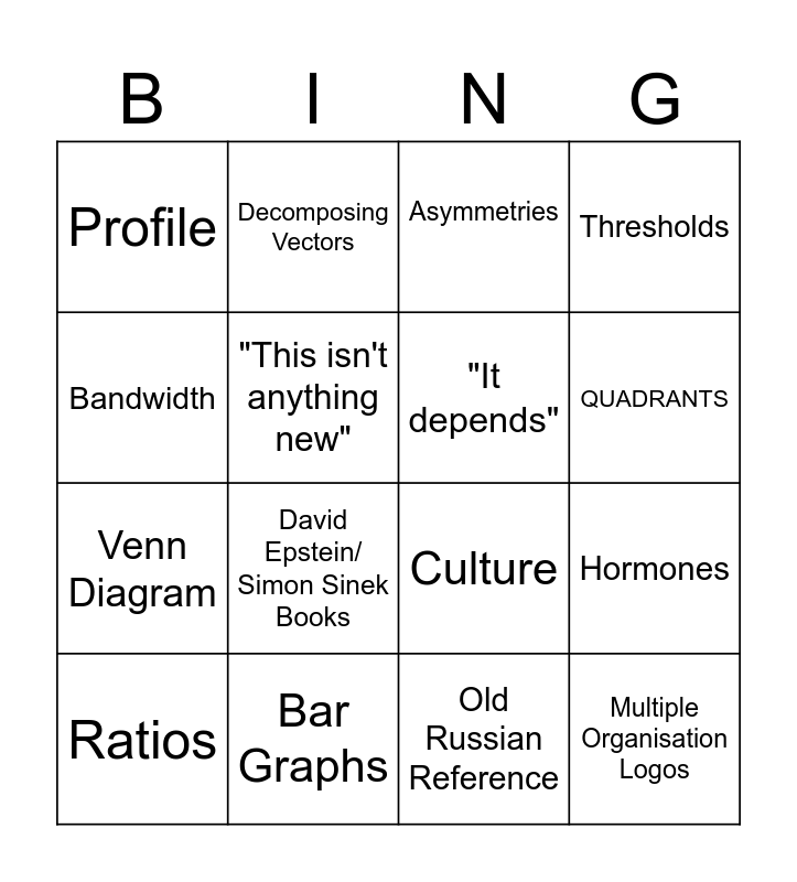 This bingo card has 16 words: Bar Graphs, Hormones, Asymmetries, Profile, Venn Diagram, Decomposing Vectors, Culture, Old Russian Reference, Bandwidth, "This isn't anything new", Ratios, Thresholds, David Epstein/ Simon Sinek Books, QUADRANTS, "It depends" and Multiple Organisation Logos.
