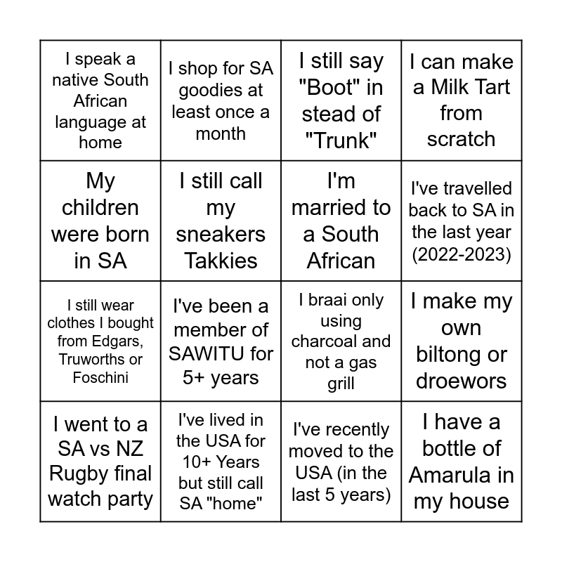 This bingo card has 16 words: I've lived in the USA for 10+ Years but still call SA "home", I make my own biltong or droewors, I still say "Boot" in stead of "Trunk", I speak a native South African language at home, I still wear clothes I bought from Edgars, Truworths or Foschini, I shop for SA goodies at least once a month, I braai only using charcoal and not a gas grill, I've recently moved to the USA (in the last 5 years), My children were born in SA, I still call my sneakers Takkies, I went to a SA vs NZ Rugby final watch party, I can make a Milk Tart from scratch, I've been a member of SAWITU for 5+ years, I've travelled back to SA in the last year (2022-2023), I'm married to a South African and I have a bottle of Amarula in my house.