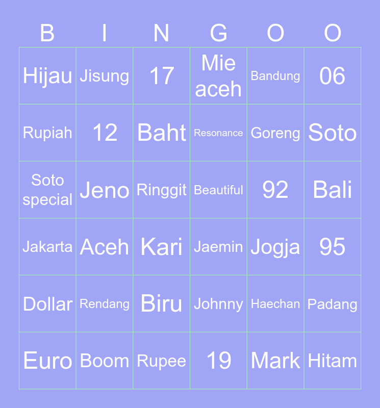 This bingo card has 36 words: Johnny, Biru, 19, Rupiah, Jakarta, Beautiful, 12, Rupee, Bandung, Haechan, Soto, Mie aceh, Padang, Jeno, Resonance, Hijau, Dollar, 92, Soto special, 17, Ringgit, Aceh, Jaemin, Kari, Jogja, Jisung, Goreng, Boom, Baht, 06, Hitam, Euro, 95, Bali, Rendang and Mark.