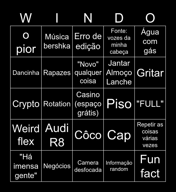 This bingo card has a free space and 59 words: Dubai, Negócios, Filmar carros, Weird flex, Informação random, Exagerar, Rapazes, Informação random sobre o Rafa, Jantar Almoço Lanche, o melhor, Fonte: vozes da minha cabeça, Informação nutricional aleatória, Dancinha, Queixar-se do preço, Lag, o pior, Fun fact, Água com gás, Musica sem copyright, "Novo" qualquer coisa, Piso, Erro de edição, "Há imensa gente", Repetir as coisas várias vezes, Música repetida, Outfit check, Dica aleatória duvidável, "Bom!", Gritar, Levar scam, Compra aleatória, Microfone estourado, Comida saudável, Jejum, Música bershka, Polícia, Chás, Rotation, "Pesado", Crypto, Livros, Audi R8, "FULL", Legit, Treinar, Maria, CS, wuant, Côco, Camera desfocada, Coisas Caras, "Porra", "Mano", "Fixe", Rafa facts, Cap, Insensível, NUNO MOURA and Dubai.