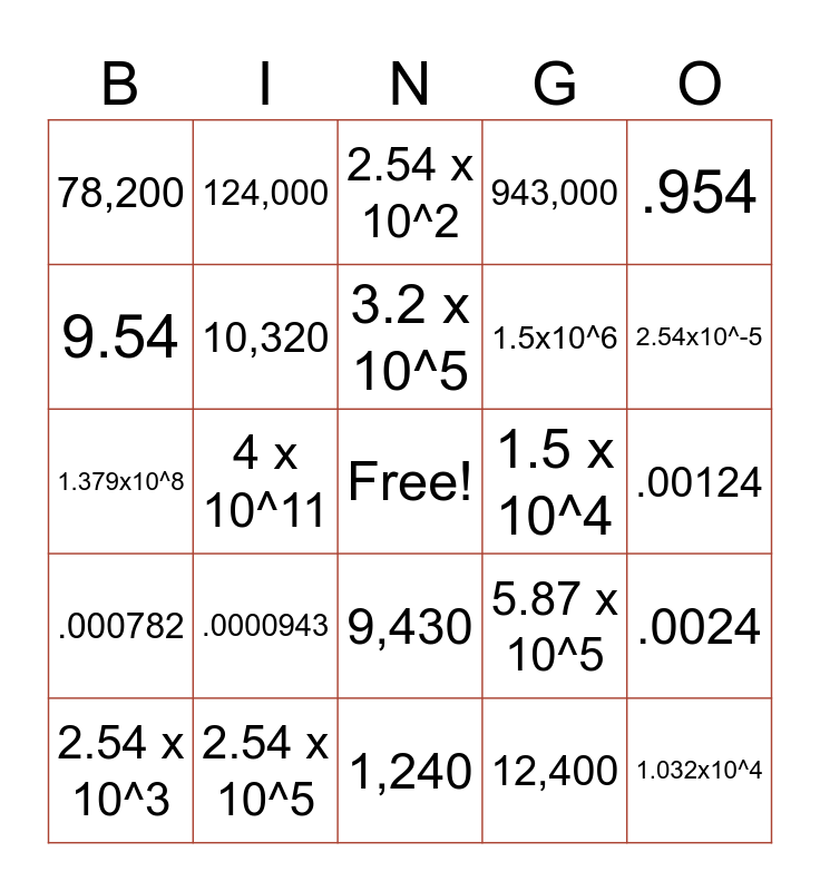 This bingo card has a free space and 24 words: .0000943, 2.54 x 10^5, 3.2 x 10^5, 2.54 x 10^3, .954, 78,200, 9.54, 124,000, 1.5 x 10^4, 9,430, 1.5x10^6, 1.379x10^8, 5.87 x 10^5, .0024, 10,320, 12,400, .00124, 2.54 x 10^2, 2.54x10^-5, 4 x 10^11, 1.032x10^4, .000782, 943,000 and 1,240.