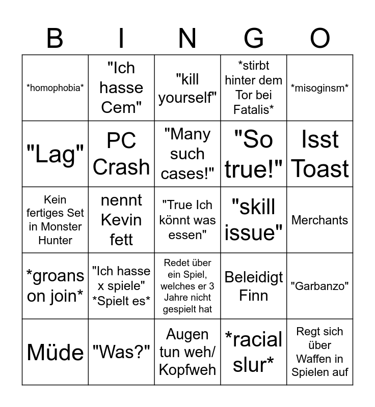 This bingo card has 25 words: *groans on join*, "Was?", "True Ich könnt was essen", *racial slur*, *misoginsm*, *homophobia*, "Ich hasse Cem", "kill yourself", "skill issue", "Garbanzo", "Lag", PC Crash, Augen tun weh/ Kopfweh, Beleidigt Finn, Isst Toast, Müde, nennt Kevin fett, "Many such cases!", "So true!", Merchants, Kein fertiges Set in Monster Hunter, "Ich hasse x spiele" *Spielt es*, Redet über ein Spiel, welches er 3 Jahre nicht gespielt hat, *stirbt hinter dem Tor bei Fatalis* and Regt sich über Waffen in Spielen auf.