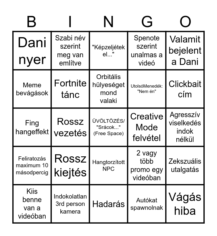 This bingo card has a free space and 34 words: Nyelvbotlás, Autókat spawnolnak, Elkezdenek random puskával lövöldözni, Éneklés, Feliratozás maximum 10 másodpercig, Fortnite tánc, Valamit bejelent a Dani, Kiis benne van a videóban, Szabi név szerint meg van említve, Leidézett faluban játszódik a videó, Orbitális hülyeséget mond valaki, "Képzeljétek el...", Glitchel a gáme, Dani beszól valakinek, Creative Mode felvétel, Clickbait cím, Indokolatlan 3rd person kamera, Fing hangeffekt, Rossz kiejtés, 2 vagy több promo egy videóban, Hangtorzított NPC, World Edit használata, Dani nyer, Agresszív viselkedés indok nélkül, Hadarás, Vágás hiba, Spenote szerint unalmas a videó, Chat megjósolja mi fog történni, UtolsóMenedék: "Nem én", Meme bevágások, Híres karakter skin, Rossz vezetés, Zekszuális utalgatás and Igénytelenség.