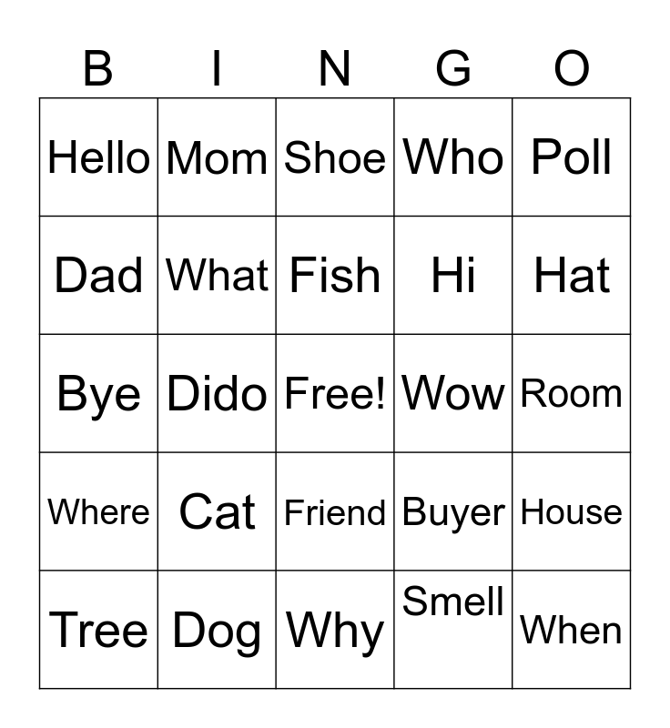 This bingo card has a free space and 24 words: Cat, Dog, Fish, Tree, Poll, Hello, Dad, Mom, Wow, Friend, Hi, Bye, Buyer, House, What, Smell, Room, Shoe, Hat, Dido, When, Where, Who and Why.