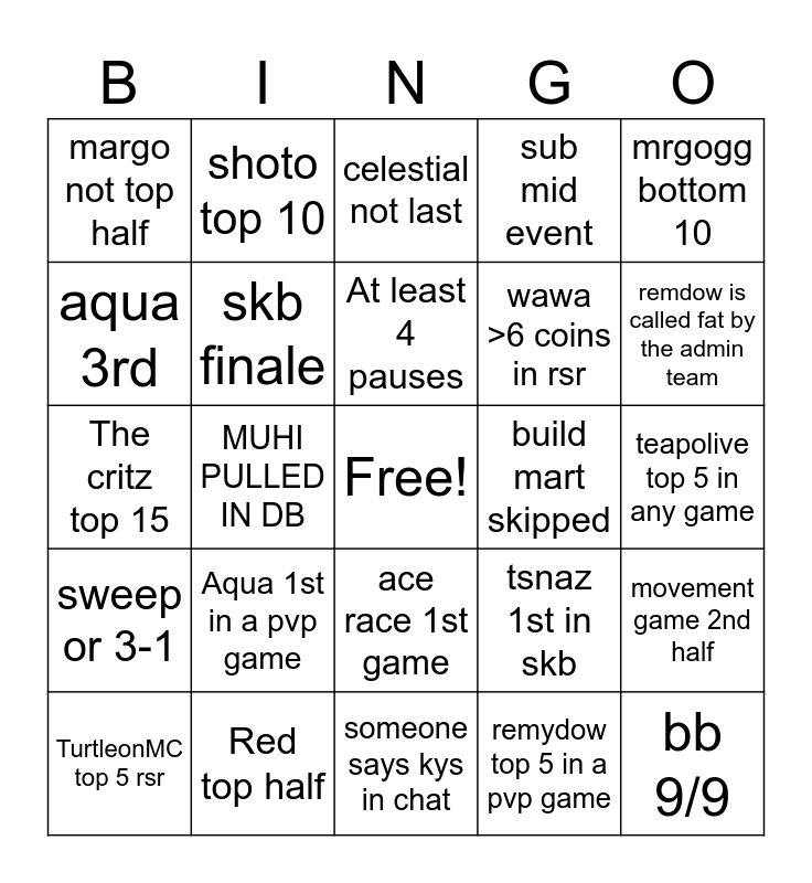 This bingo card has a free space and 24 words: Aqua 1st in a pvp game, Red top half, At least 4 pauses, TurtleonMC top 5 rsr, mrgogg bottom 10, margo not top half, aqua 3rd, shoto top 10, build mart skipped, ace race 1st game, wawa >6 coins in rsr, The critz top 15, tsnaz 1st in skb, movement game 2nd half, skb finale, remydow top 5 in a pvp game, teapolive top 5 in any game, celestial not last, remdow is called fat by the admin team, MUHI PULLED IN DB, bb 9/9, sweep or 3-1, sub mid event and someone says kys in chat.