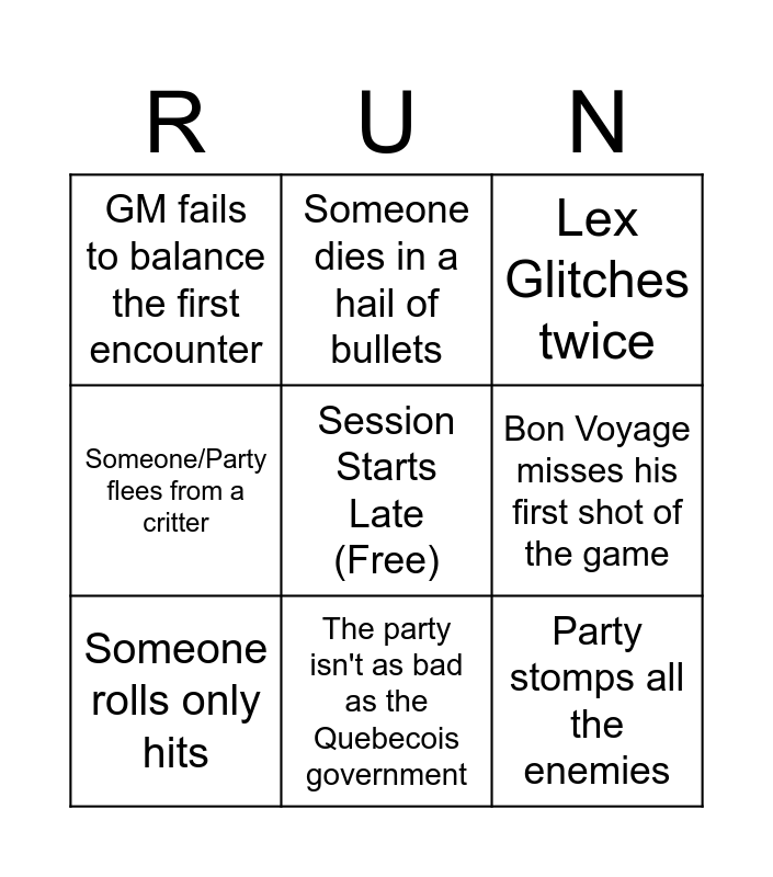 This bingo card has a free space and 8 words: Bon Voyage misses his first shot of the game, Lex Glitches twice, Someone dies in a hail of bullets, Someone rolls only hits, GM fails to balance the first encounter, Party stomps all the enemies, Someone/Party flees from a critter and The party isn't as bad as the Quebecois government.