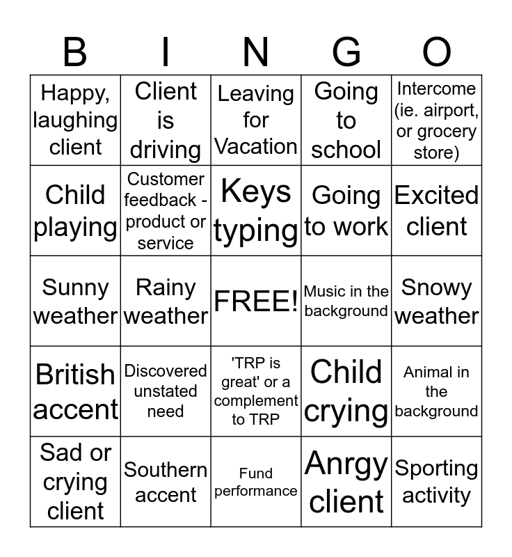 This bingo card has a free space and 24 words: Discovered unstated need, Southern accent, Keys typing, Sad or crying client, Intercome (ie. airport, or grocery store), Happy, laughing client, Child playing, Client is driving, Music in the background, 'TRP is great' or a complement to TRP, Going to work, Sunny weather, Child crying, Animal in the background, Customer feedback -product or service, Anrgy client, Snowy weather, Leaving for Vacation, Excited client, Rainy weather, Sporting activity, British accent, Going to school and Fund performance.