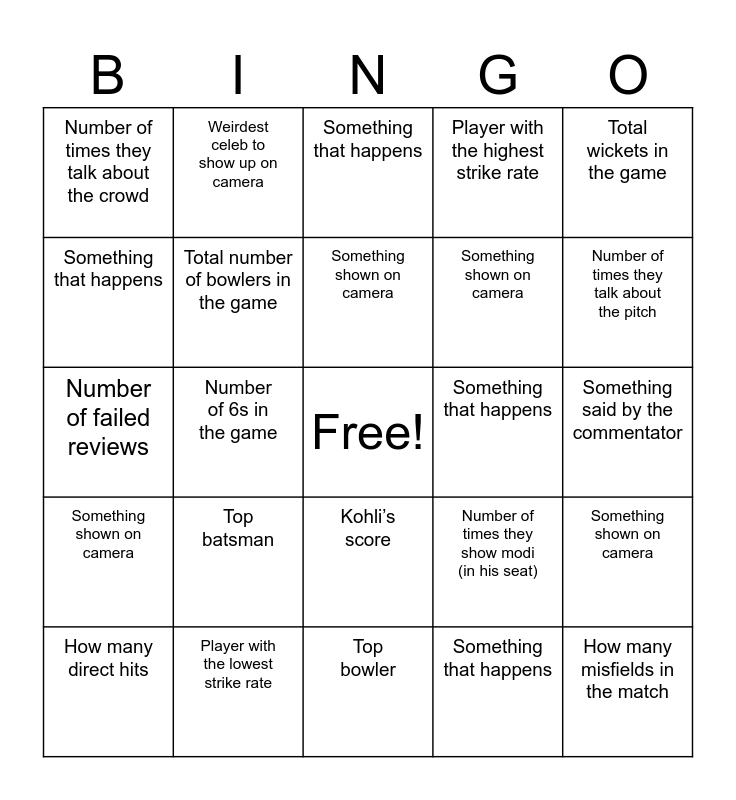 This bingo card has a free space and 24 words: Top batsman, Player with the lowest strike rate, Something shown on camera, How many direct hits, Total wickets in the game, Number of times they talk about the crowd, Something that happens, Weirdest celeb to show up on camera, Something that happens, Kohli’s score, Something shown on camera, Number of failed reviews, Number of times they show modi (in his seat), Something shown on camera, Total number of bowlers in the game, Something that happens, Something said by the commentator, Something that happens, Number of times they talk about the pitch, Number of 6s in the game, How many misfields in the match, Something shown on camera, Player with the highest strike rate and Top bowler.