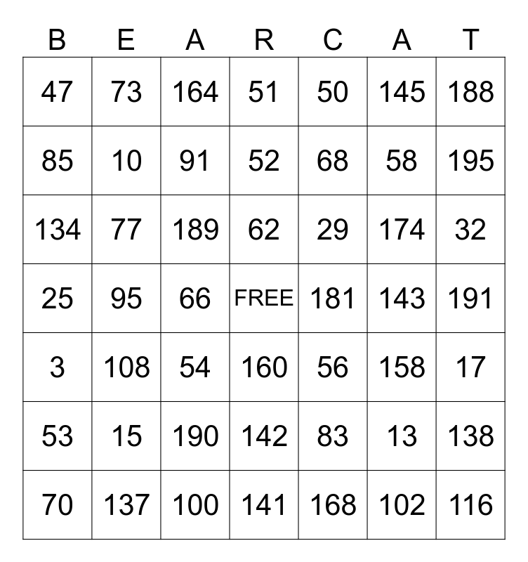 This bingo card has a free space and 195 words: 1, 2, 3, 4, 5, 6, 7, 8, 9, 10, 11, 12, 13, 14, 15, 16, 17, 18, 19, 20, 21, 22, 23, 24, 25, 26, 27, 28, 29, 30, 31, 32, 33, 34, 35, 36, 37, 38, 39, 40, 41, 42, 43, 44, 45, 46, 47, 48, 49, 50, 51, 52, 53, 54, 55, 56, 57, 58, 59, 60, 61, 62, 63, 64, 65, 66, 67, 68, 69, 70, 71, 72, 73, 74, 75, 76, 77, 78, 79, 80, 81, 82, 83, 84, 85, 86, 87, 88, 89, 90, 91, 92, 93, 94, 95, 96, 97, 98, 99, 100, 101, 102, 103, 104, 105, 106, 107, 108, 109, 110, 111, 112, 113, 114, 115, 116, 117, 118, 119, 120, 121, 122, 123, 124, 125, 126, 127, 128, 129, 130, 131, 132, 133, 134, 135, 136, 137, 138, 139, 140, 141, 142, 143, 144, 145, 146, 147, 148, 149, 150, 151, 152, 153, 154, 155, 156, 157, 158, 159, 160, 161, 162, 163, 164, 165, 166, 167, 168, 169, 170, 171, 172, 173, 174, 175, 176, 178, 179, 180, 181, 182, 183, 184, 185, 186, 187, 188, 189, 190, 191, 192, 193, 194, 195 and 196.
