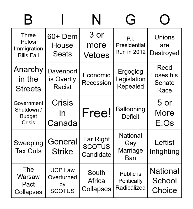 This bingo card has a free space and 24 words: General Strike, UCP Law Overturned by SCOTUS, Economic Recession, The Warsaw Pact Collapses, Unions are Destroyed, Three Pelosi Immigration Bills Fail, Anarchy in the Streets, 60+ Dem House Seats, Ballooning Deficit, Far Right SCOTUS Candidate, Ergoglog Legislation Repealed, Government Shutdown / Budget Crisis, National Gay Marriage Ban, Leftist Infighting, Davenport is Overtly Racist, Public is Politically Radicalized, 5 or More E.Os, 3 or more Vetoes, Reed Loses his Senate Race, Crisis in Canada, National School Choice, Sweeping Tax Cuts, P.I. Presidential Run in 2012 and South Africa Collapses.