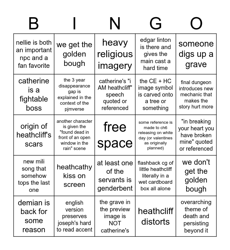 This bingo card has a free space and 24 words: heathcathy kiss on screen, english version preserves joseph's hard to read accent, catherine's "i AM heathcliff" speech quoted or referenced, demian is back for some reason, someone digs up a grave, nellie is both an important npc and a fan favorite, catherine is a fightable boss, we get the golden bough, some reference is made to ch6 releasing on white day (or valentines as originally planned), at least one of the servants is genderbent, the CE + HC image symbol is carved onto a tree or something, origin of heathcliff's scars, flashback cg of little heathcliff literally in a wet cardboard box all alone, we don't get the golden bough, the 3 year disappearance gap is explained in the context of the pjmverse, heathcliff distorts, "in breaking your heart you have broken mine" quoted or referenced, heavy religious imagery, final dungeon introduces new mechanic that makes the story hurt more, another character is given the "found dead in front of an open window in the rain" scene, overarching theme of death and persisting beyond it, new mili song that somehow tops the last one, edgar linton is there and gives the main cast a hard time and the grave in the preview image is NOT catherine's.