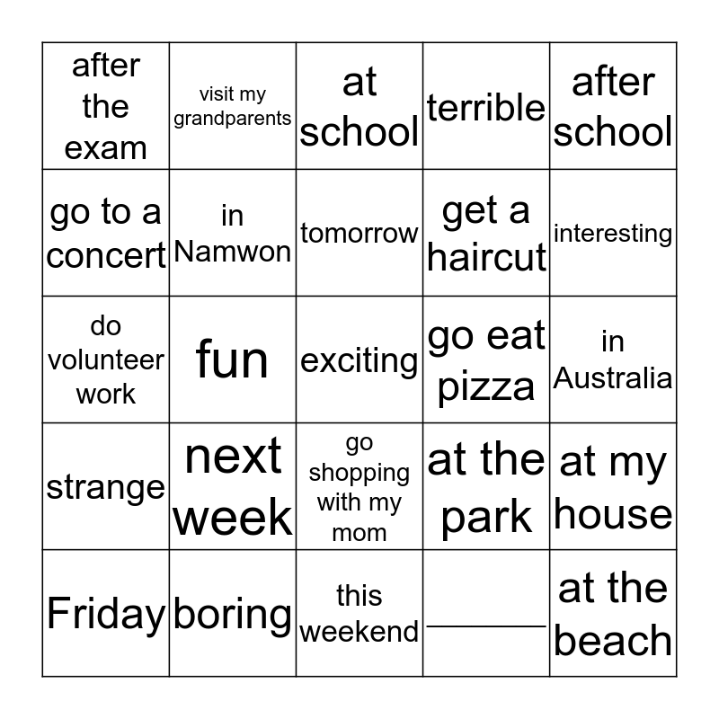 This bingo card has 25 words: next week, this weekend, tomorrow, Friday, after school, after the exam, go to a concert, visit my grandparents, go eat pizza, go shopping with my mom, get a haircut, do volunteer work, at the park, at my house, in Namwon, at the beach, in Australia, at school, interesting, fun, exciting, boring, strange, terrible and ________.