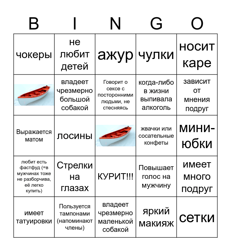 This bingo card has 1 images, a free space and 23 words: Стрелки на глазах, Пользуется тампонами (напоминают члены), Говорит о сексе с посторонними людьми, не стесняясь, имеет татуировки, носит каре, чокеры, не любит детей, жвачки или сосательные конфеты, КУРИТ!!!, когда-либо в жизни выпивала алкоголь, Выражается матом, Повышает голос на мужчину, имеет много подруг, владеет чрезмерно большой собакой, яркий макияж, мини-юбки, ажур, зависит от мнения подруг, лосины, сетки, любит есть фастфуд (=в мужчинах тоже не разборчива, её легко купить), чулки and владеет чрезмерно маленькой собакой.
