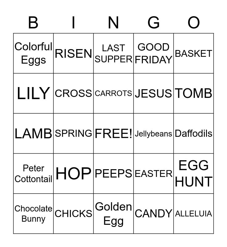 This bingo card has a free space and 24 words: HOP, CHICKS, CARROTS, Chocolate Bunny, BASKET, Colorful Eggs, LILY, RISEN, Jellybeans, PEEPS, JESUS, LAMB, EASTER, EGG HUNT, CROSS, CANDY, Daffodils, LAST SUPPER, TOMB, SPRING, ALLELUIA, Peter Cottontail, GOOD FRIDAY and Golden Egg.
