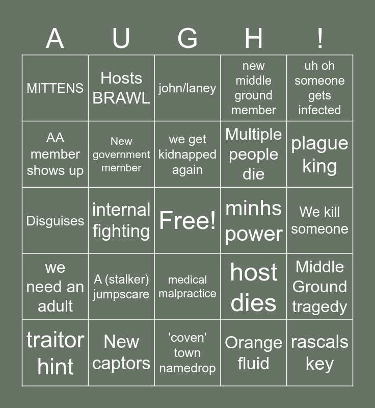 This bingo card has a free space and 37 words: divorce settlement, AA tragedy, UNGNE tragedy, New government member, Middle Ground tragedy, A (stalker) jumpscare, we get kidnapped again, zookeeper reveal, uh oh someone gets infected, plague hivemind, internal fighting, new middle ground member, rascals key, We kill someone, AA member shows up, we need an adult, jangles, john/laney, medical malpractice, minhs power, MITTENS, plague king, traitor hint, 'coven' town namedrop, Animals escape zoo, Orange fluid, Hosts BRAWL, Among us, Gang gets separated, Someone goes missing, Yaoi/Yuri, New captors, Disguises, Someone DIES, host dies, Multiple people die and Someone snaps.