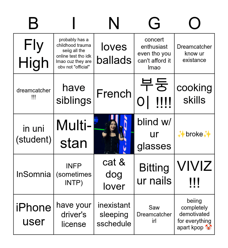 This bingo card has a free space and 24 words: INFP (sometimes INTP), have your driver's license, French, iPhone user, Dreamcatcher know ur existance, Fly High, dreamcatcher !!!, probably has a childhood trauma seiig all the online test tho idk lmao cuz they are obv not "official", blind w/ ur glasses, cat & dog lover, 부둥이 !!!!, in uni (student), Bitting ur nails, VIVIZ !!!, have siblings, Saw Dreamcatcher irl, ✨broke✨, loves ballads, cooking skills, Multi-stan, beiing completely demotivated for everything apart kpop 🤡, InSomnia, concert enthusiast even tho you can't afford it lmao and inexistant sleeping sschedule.
