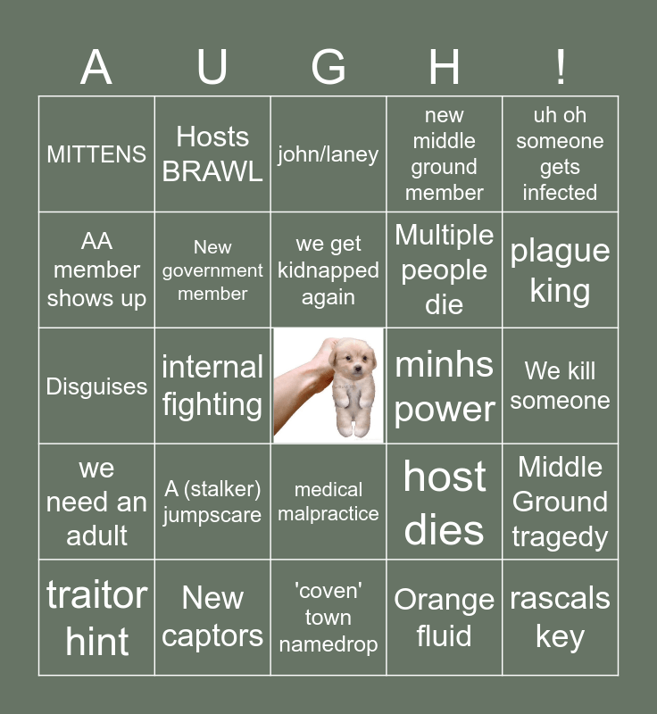 This bingo card has a free space and 37 words: divorce settlement, AA tragedy, UNGNE tragedy, New government member, Middle Ground tragedy, A (stalker) jumpscare, we get kidnapped again, zookeeper reveal, uh oh someone gets infected, plague hivemind, internal fighting, new middle ground member, rascals key, We kill someone, AA member shows up, we need an adult, jangles, john/laney, medical malpractice, minhs power, MITTENS, plague king, traitor hint, 'coven' town namedrop, Animals escape zoo, Orange fluid, Hosts BRAWL, Among us, Gang gets separated, Someone goes missing, Yaoi/Yuri, New captors, Disguises, Someone DIES, host dies, Multiple people die and Someone snaps.
