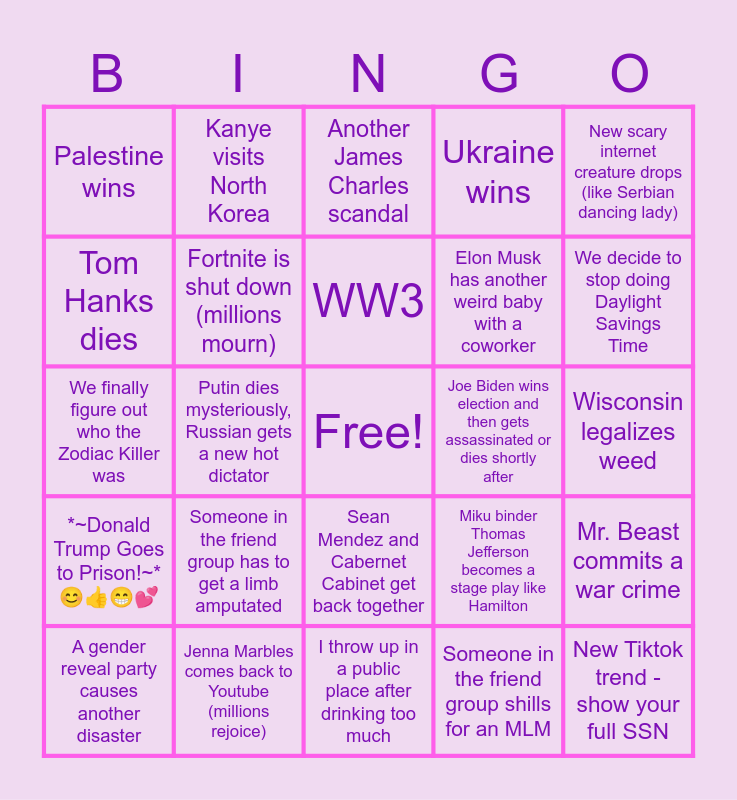 This bingo card has a free space and 24 words: Someone in the friend group has to get a limb amputated, Jenna Marbles comes back to Youtube (millions rejoice), WW3, A gender reveal party causes another disaster, New scary internet creature drops (like Serbian dancing lady), Palestine wins, Tom Hanks dies, Kanye visits North Korea, Joe Biden wins election and then gets assassinated or dies shortly after, Sean Mendez and Cabernet Cabinet get back together, Elon Musk has another weird baby with a coworker, We finally figure out who the Zodiac Killer was, Miku binder Thomas Jefferson becomes a stage play like Hamilton, Mr. Beast commits a war crime, Fortnite is shut down (millions mourn), Someone in the friend group shills for an MLM, Wisconsin legalizes weed, Another James Charles scandal, We decide to stop doing Daylight Savings Time, Putin dies mysteriously, Russian gets a new hot dictator, New Tiktok trend - show your full SSN, *~Donald Trump Goes to Prison!~*๐๐๐๐, Ukraine wins and I throw up in a public place after drinking too much.