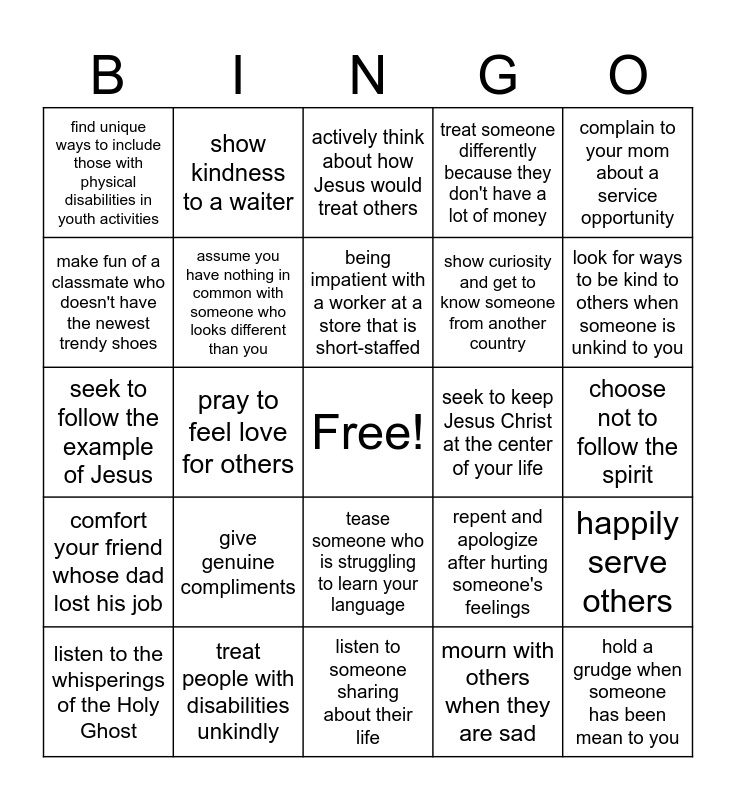 This bingo card has a free space and 25 words: give genuine compliments, listen to someone sharing about their life, being impatient with a worker at a store that is short-staffed, listen to the whisperings of the Holy Ghost, complain to your mom about a service opportunity, find unique ways to include those with physical disabilities in youth activities, make fun of a classmate who doesn't have the newest trendy shoes, show kindness to a waiter, seek to keep Jesus Christ at the center of your life, tease someone who is struggling to learn your language, show curiosity and get to know someone from another country, seek to follow the example of Jesus, repent and apologize after hurting someone's feelings, happily serve others, assume you have nothing in common with someone who looks different than you, make fun of what someone is wearing, choose not to follow the spirit, actively think about how Jesus would treat others, look for ways to be kind to others when someone is unkind to you, pray to feel love for others, hold a grudge when someone has been mean to you, treat people with disabilities unkindly, comfort your friend whose dad lost his job, treat someone differently because they don't have a lot of money and mourn with others when they are sad.