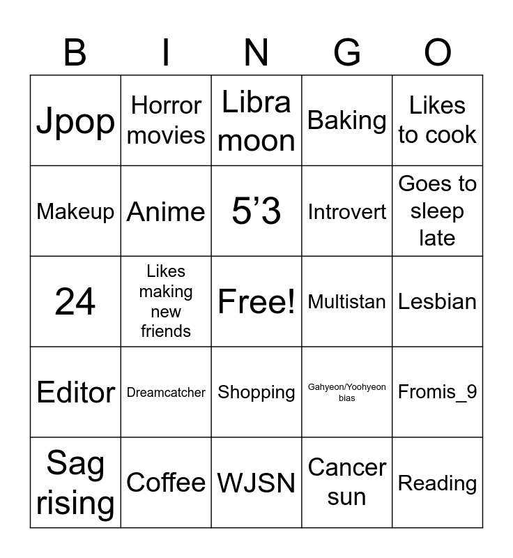 This bingo card has a free space and 24 words: Dreamcatcher, Coffee, 5’3, Sag rising, Likes to cook, Jpop, Makeup, Horror movies, Multistan, Shopping, Introvert, 24, Gahyeon/Yoohyeon bias, Fromis_9, Anime, Cancer sun, Lesbian, Libra moon, Goes to sleep late, Likes making new friends, Reading, Editor, Baking and WJSN.