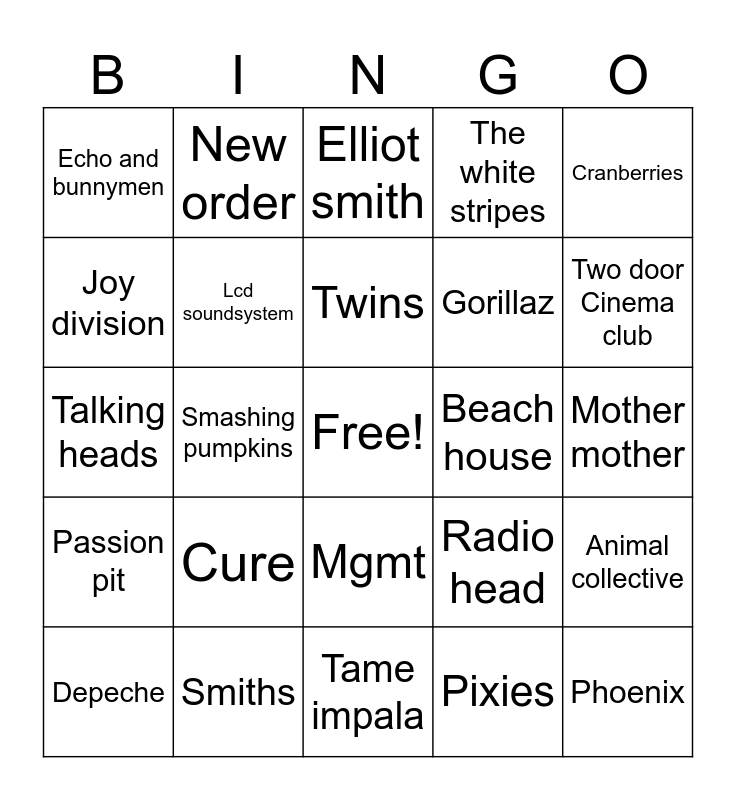 This bingo card has a free space and 24 words: Cure, Smiths, Twins, Depeche, Cranberries, Echo and bunnymen, Joy division, New order, Beach house, Mgmt, Gorillaz, Talking heads, Radio head, Animal collective, Lcd soundsystem, Pixies, Mother mother, Elliot smith, Two door Cinema club, Smashing pumpkins, Phoenix, Passion pit, The white stripes and Tame impala.