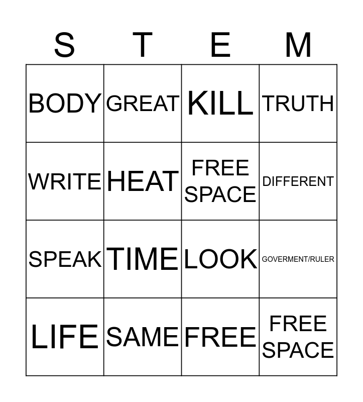 This bingo card has 16 words: SAME, GOVERMENT/RULER, KILL, BODY, SPEAK, GREAT, LOOK, FREE, WRITE, HEAT, LIFE, TRUTH, TIME, DIFFERENT, FREE SPACE and FREE SPACE.