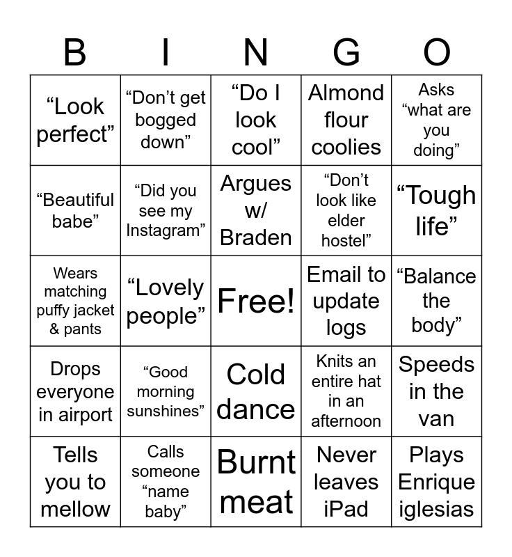 This bingo card has a free space and 24 words: “Good morning sunshines”, Calls someone “name baby”, Argues w/ Braden, Tells you to mellow, Asks “what are you doing”, “Look perfect”, “Beautiful babe”, “Don’t get bogged down”, Email to update logs, Cold dance, “Don’t look like elder hostel”, Wears matching puffy jacket & pants, Knits an entire hat in an afternoon, Speeds in the van, “Did you see my Instagram”, Never leaves iPad, “Balance the body”, “Do I look cool”, “Tough life”, “Lovely people”, Plays Enrique iglesias, Drops everyone in airport, Almond flour coolies and Burnt meat.