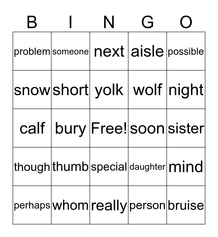 This bingo card has a free space and 24 words: thumb, whom, yolk, perhaps, possible, problem, snow, someone, soon, special, wolf, calf, daughter, mind, short, person, sister, next, night, bury, bruise, though, aisle and really.