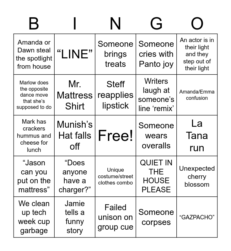 This bingo card has a free space and 24 words: “Does anyone have a charger?”, Jamie tells a funny story, Steff reapplies lipstick, We clean up tech week cup garbage, An actor is in their light and they step out of their light, Amanda or Dawn steal the spotlight from house, Marlow does the opposite dance move that she’s supposed to do, “LINE”, Someone wears overalls, Unique costume/street clothes combo, Writers laugh at someone’s line ‘remix’, Mark has crackers hummus and cheese for lunch, QUIET IN THE HOUSE PLEASE, Unexpected cherry blossom, Mr. Mattress Shirt, Someone corpses, La Tana run, Someone brings treats, Amanda/Emma confusion, Munish’s Hat falls off, “GAZPACHO”, “Jason can you put on the mattress”, Someone cries with Panto joy and Failed unison on group cue.