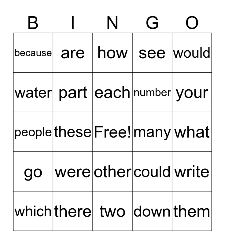 This bingo card has a free space and 24 words: were, there, each, which, would, because, water, are, many, other, number, people, could, write, part, down, what, how, your, these, them, go, see and two.
