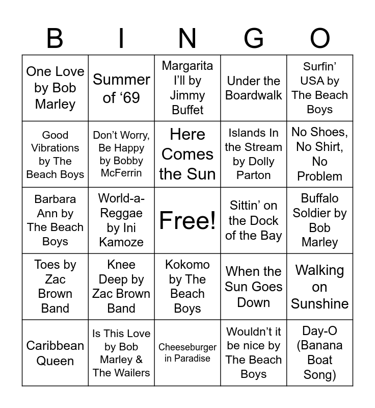 This bingo card has a free space and 30 words: Is This Love by Bob Marley & The Wailers, Jamming (7” version) by Bob Marley, World-a-Reggae by Ini Kamoze, Jamaica Jamaica by Busy Single, One Love by Bob Marley, Margarita I’ll by Jimmy Buffet, Don’t Worry, Be Happy by Bobby McFerrin, Kokomo by The Beach Boys, Sittin’ on the Dock of the Bay, Cheeseburger in Paradise, Buffalo Soldier by Bob Marley, Day-O (Banana Boat Song), Wouldn’t it be nice by The Beach Boys, Soak up the Sun by Cheryl Crow, No Shoes, No Shirt, No Problem, It’s Five o’clock Somewhere, When the Sun Goes Down, Toes by Zac Brown Band, Knee Deep by Zac Brown Band, Surfin’ USA by The Beach Boys, Barbara Ann by The Beach Boys, It’s Bitsy Teenie Weenie Yellow Polka Dot Bikini, Summer of ‘69, Islands In the Stream by Dolly Parton, Good Vibrations by The Beach Boys, Under the Boardwalk, Walking on Sunshine, Caribbean Queen, Here Comes the Sun and Wipe Out.