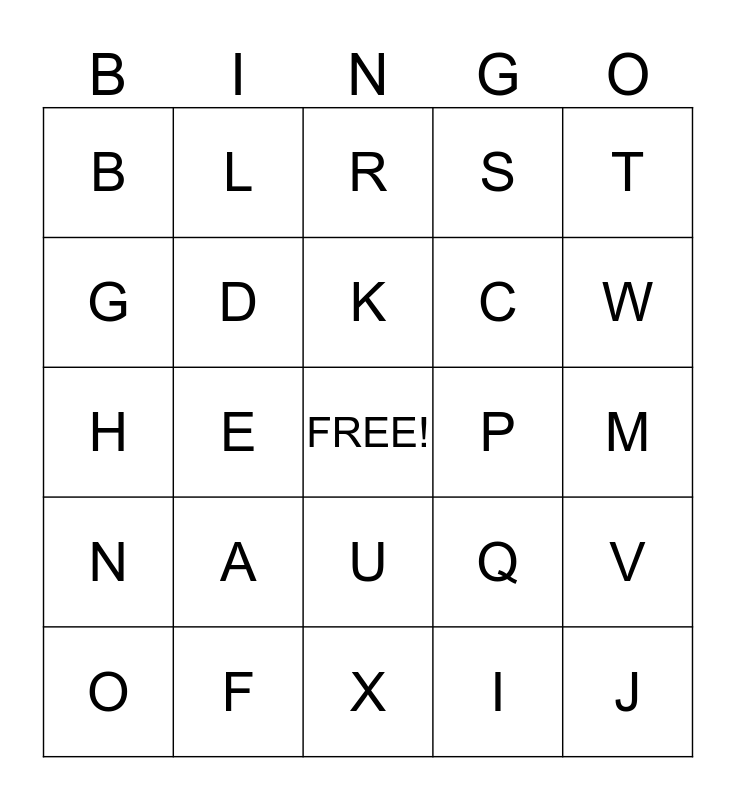 This bingo card has a free space and 24 words: A, F, K, O, T, B, G, L, P, U, C, H, Q, V, D, I, M, R, W, E, J, N, S and X.