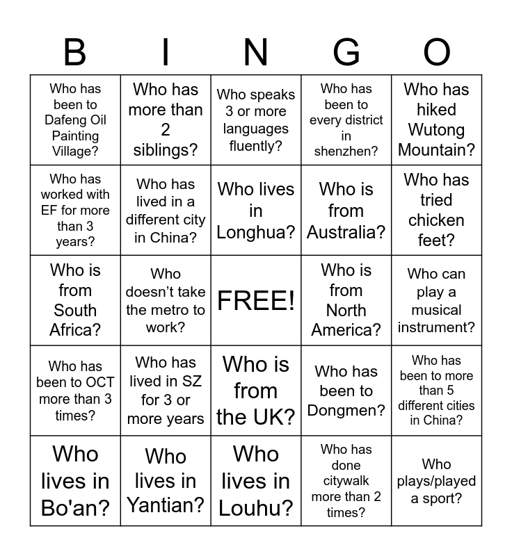 This bingo card has a free space and 24 words: Who has lived in SZ for 3 or more years, Who lives in Yantian?, Who lives in Longhua?, Who lives in Bo'an?, Who has hiked Wutong Mountain?, Who has been to Dafeng Oil Painting Village?, Who has worked with EF for more than 3 years?, Who has more than 2 siblings?, Who is from North America?, Who is from the UK?, Who is from Australia?, Who is from South Africa?, Who has been to Dongmen?, Who has been to more than 5 different cities in China?, Who has lived in a different city in China?, Who has done citywalk more than 2 times?, Who can play a musical instrument?, Who speaks 3 or more languages fluently?, Who has tried chicken feet?, Who doesn’t take the metro to work?, Who plays/played a sport?, Who has been to OCT more than 3 times?, Who has been to every district in shenzhen? and Who lives in Louhu?.