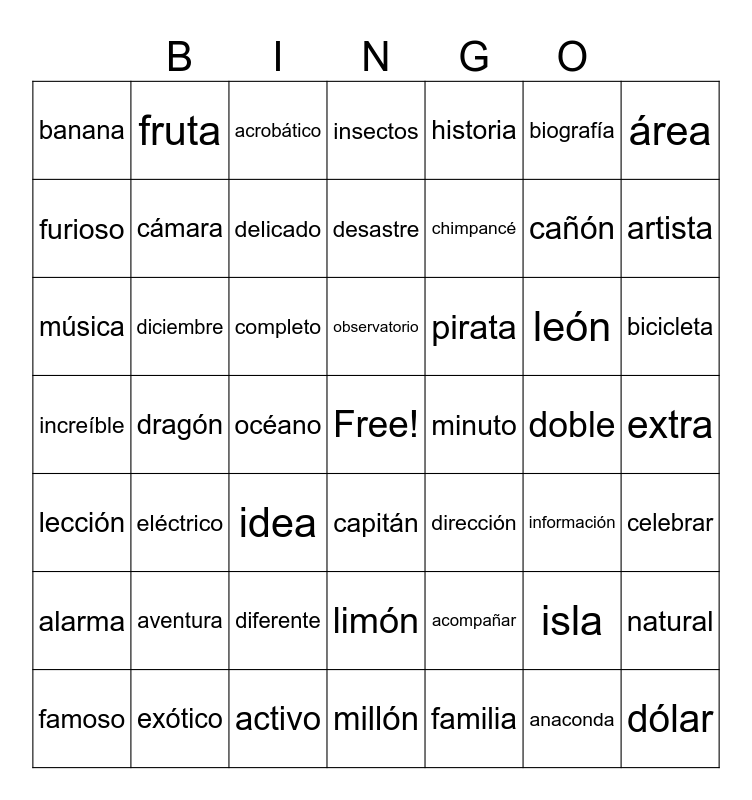 This bingo card has a free space and 85 words: accidente, acompañar, acrobático, activo, admirar, adulto, aventura, africano, alarma, anaconda, animal, anunciar, área, artista, autógrafo, banana, bicicleta, biografía, brillante, capitán, celebrar, cámara, cañón, ceremonia, chimpancé, color, centro, confusión, continuar, confeti, completo, dinosaurio, dirección, desastre, dólar, doble, dragón, dinamita, diciembre, delicado, diferente, eléctrico, explosión, energía, extra, exótico, familia, famoso, favorito, flor, fruta, furioso, idea, funeral, identificación, inmediatamente, increíble, insectos, información, isla, investigar, hospital, hotel, helicóptero, hipopótamo, historia, honor, león, limón, líder, localizar, lección, nervioso, natural, objeto, observatorio, océano, octubre, máquina, magia, música, minuto, millón, pirata and pingüino.