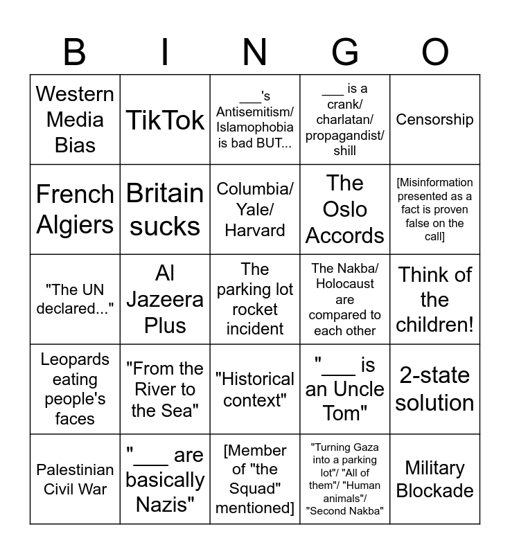 This bingo card has 25 words: "From the River to the Sea", [Member of "the Squad" mentioned], Columbia/ Yale/ Harvard, Palestinian Civil War, Censorship, Western Media Bias, French Algiers, TikTok, The Nakba/ Holocaust are compared to each other, "Historical context", The Oslo Accords, "The UN declared...", "___ is an Uncle Tom", 2-state solution, Britain sucks, Military Blockade, Think of the children!, ___'s Antisemitism/ Islamophobia is bad BUT..., [Misinformation presented as a fact is proven false on the call], Al Jazeera Plus, The parking lot rocket incident, "___ are basically Nazis", Leopards eating people's faces, ___ is a crank/ charlatan/ propagandist/ shill and "Turning Gaza into a parking lot"/ "All of them"/ "Human animals"/ "Second Nakba".