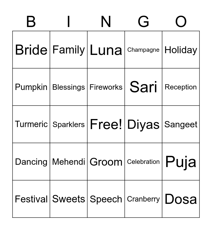 This bingo card has a free space and 24 words: Mehendi, Sweets, Fireworks, Festival, Holiday, Bride, Pumpkin, Family, Diyas, Groom, Sari, Turmeric, Celebration, Puja, Blessings, Cranberry, Sangeet, Luna, Reception, Sparklers, Dosa, Dancing, Champagne and Speech.