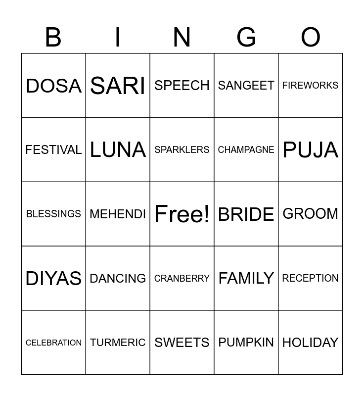 This bingo card has a free space and 24 words: DANCING, TURMERIC, SPARKLERS, CELEBRATION, FIREWORKS, DOSA, FESTIVAL, SARI, BRIDE, CRANBERRY, CHAMPAGNE, BLESSINGS, FAMILY, RECEPTION, LUNA, PUMPKIN, GROOM, SPEECH, PUJA, MEHENDI, HOLIDAY, DIYAS, SANGEET and SWEETS.